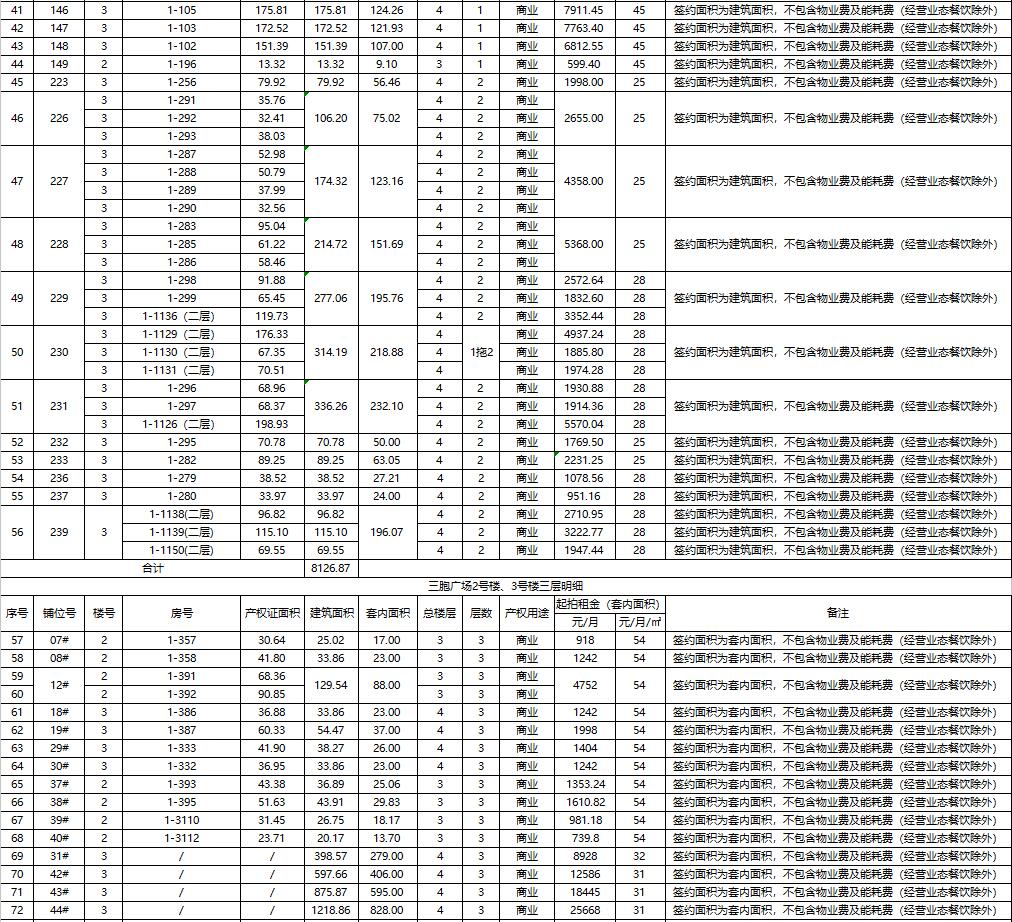 1.三胞廣場(chǎng)商鋪78處,面積分別為數(shù)十至數(shù)百平米不等,均為閑置。租期3-5年。