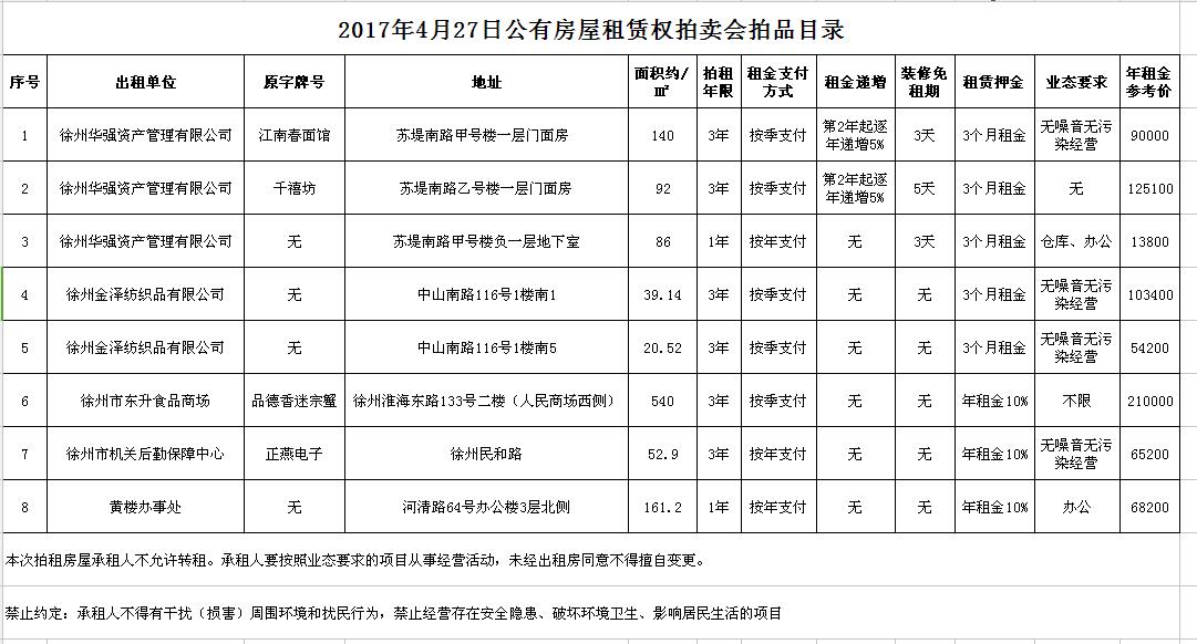關(guān)注微信公眾號我公司受委托,定于2017年4月27日10時開始,通過中國拍賣行業(yè)協(xié)會網(wǎng)絡拍賣平臺(http://pm.caa123.org.cn),以網(wǎng)絡競價的方式公開拍賣公有房屋租賃權(quán)一批,租賃期限均為3年,以下房屋均為空房: