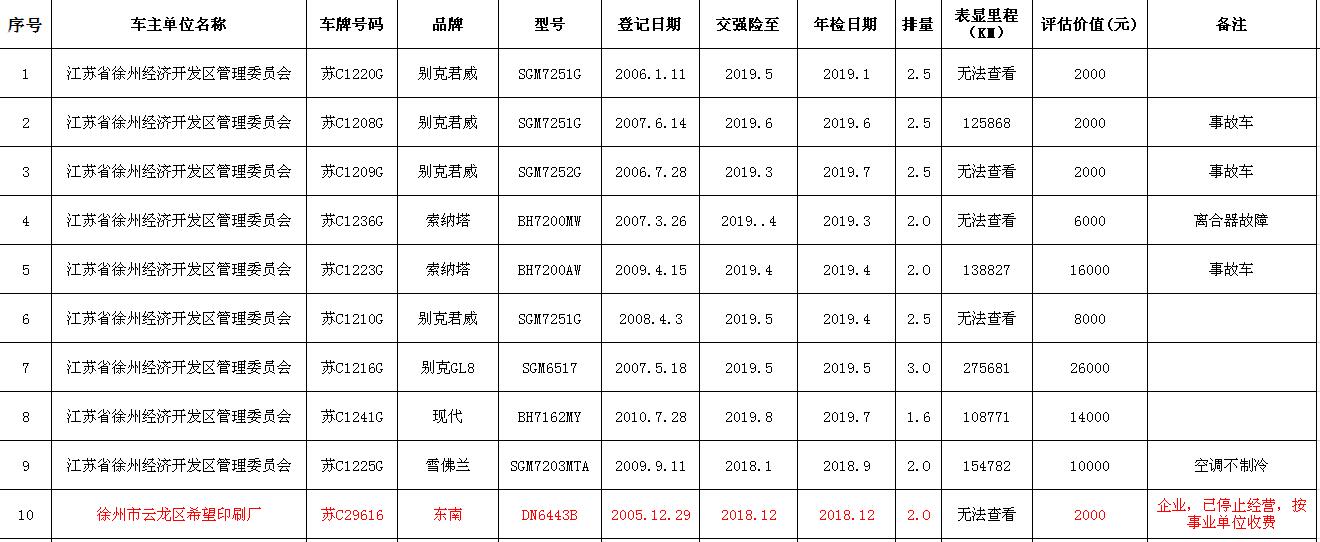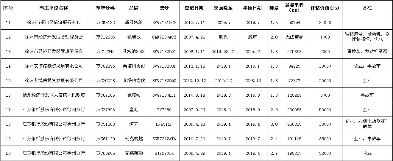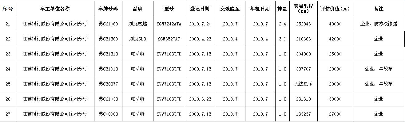 關(guān)注微信公眾號(hào)我公司受委托,定于2018年9月14日10時(shí)在中山南路55號(hào)三樓本公司拍賣(mài)廳公開(kāi)拍賣(mài):江蘇銀行股份有限公司徐州分行、徐州經(jīng)濟(jì)技術(shù)開(kāi)發(fā)區(qū)、銅山區(qū)、云龍區(qū)公務(wù)車(chē)輛二十余輛。主要車(chē)型有帕薩特、皇冠、道奇、別克、克萊斯勒等。