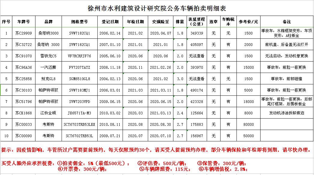 關(guān)注微信公眾號受委托,我公司定于2020年4月1日13:00時在徐州市銀地二手車交易市場四樓東南拍賣大廳通過現(xiàn)場和汽車街網(wǎng)絡(luò)拍賣平臺同步進(jìn)行的方式公開拍賣:徐州市水利建筑設(shè)計研究院公務(wù)車輛10輛,主要車型有帕薩特、桑塔納、雪鐵龍C5、邁騰、全順、GL8、考斯特等。
