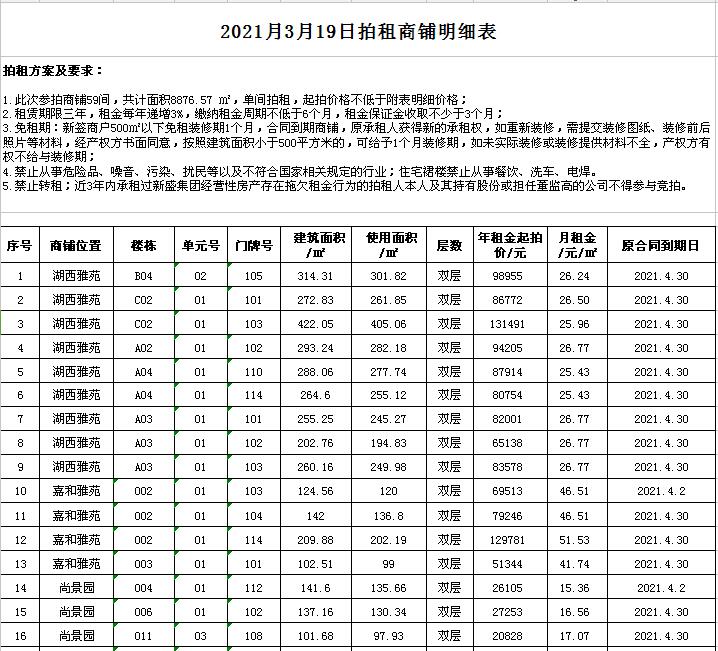 關(guān)注微信公眾號我公司受委托,定于2021年3月19日9:30時在徐州市云泉山莊主樓3樓第七會議廳公開拍租以下商鋪:湖西雅苑16間、嘉和雅苑5間、漢襄佳苑6間、尚景園5間、玉潭佳苑8間、紫荊園2間、玉棠苑1間、楓情水岸4間、和風(fēng)雅致12間。面積分別約為數(shù)十至三百余平米不等,租期均為三年。