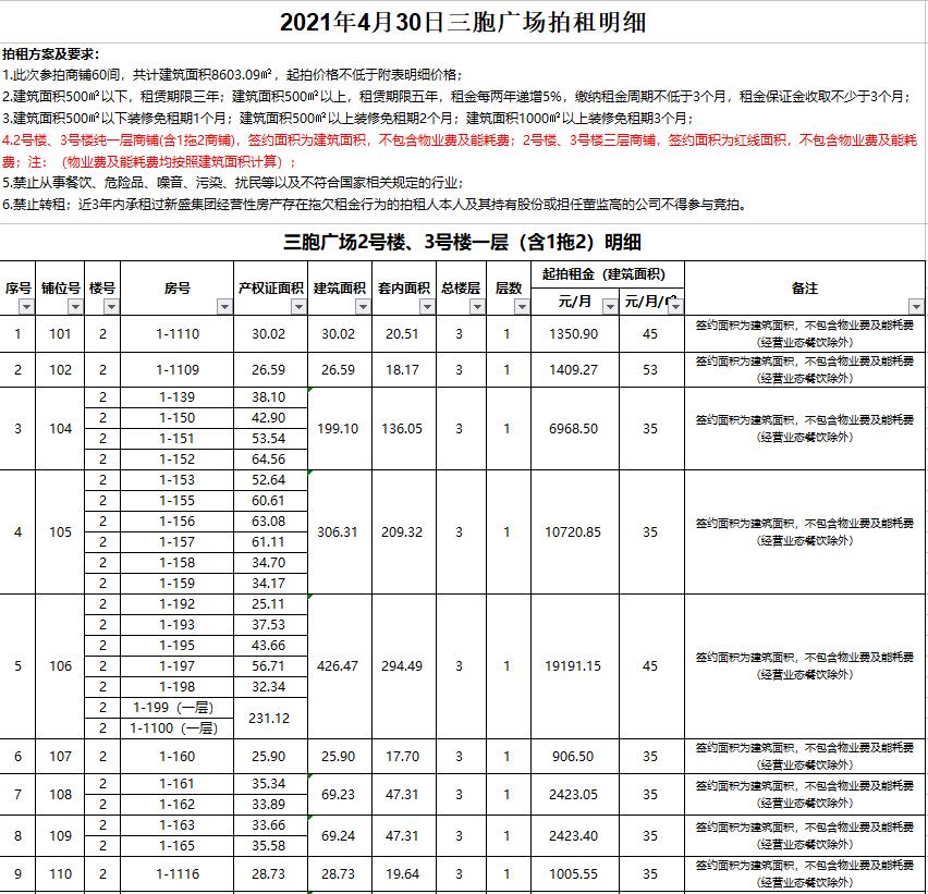 關(guān)注微信公眾號我公司受委托,定于2021年4月30日10時在徐州市中山南路55號三樓本公司拍賣廳公開拍租:新盛集團位于三胞廣場商鋪及辦公房一批,面積分別為數(shù)十至數(shù)百平米不等,均為閑置。租期3-5年。禁止從事危險品、有污染及擾民的行業(yè)經(jīng)營。